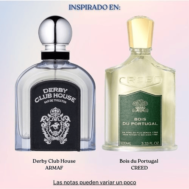 Derby Club House de Armaf es una fragancia de la familia olfativa Amaderada Aromática para Hombres. Las Notas de Salida son lavanda y bergamota; las Notas de Corazón son notas especiadas, palo de rosa de la India, cedro y pachulí; las Notas de Fondo son haba tonka, vainilla y ámbar blanco. Inspirado en Bois du Portugal de Creed.