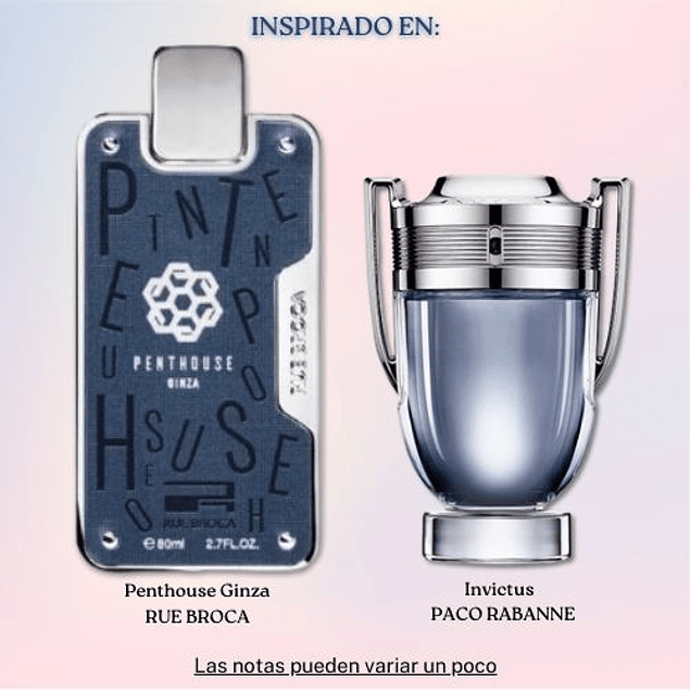 Penthouse Ginza de Rue Broca es una fragancia de la familia olfativa Ámbar Fougère para Hombres y Mujeres. Penthouse Ginza se lanzó en 2020. Las Notas de Salida son bergamota y toronja (pomelo); las Notas de Corazón son hoja de laurel, jazmín y lavanda; las Notas de Fondo son musgo de roble, pachulí y ámbar. Inspirado en Invictus de Paco Rabanne.